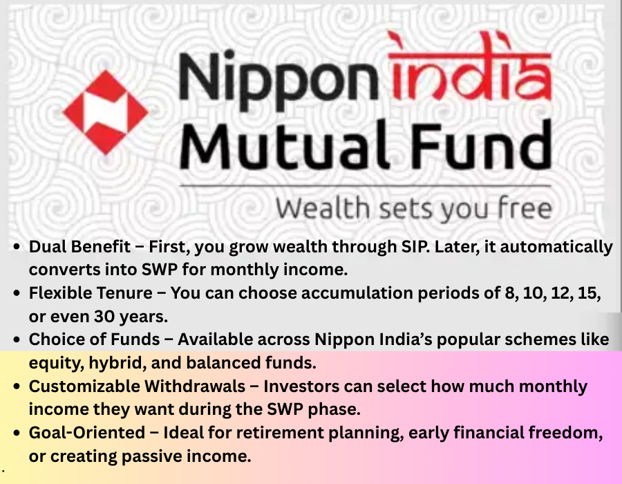 Nippon India was among the first to launch a dedicated Freedom SIP plan. Investors can choose to invest through SIP for a fixed duration (like 8, 10, or 12 years). After this accumulation period, the investment automatically shifts to an SWP mode, giving monthly payouts.